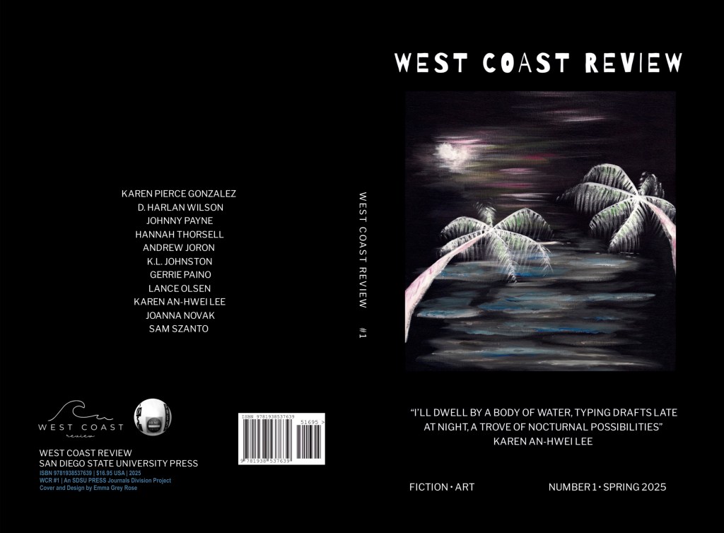 The premiere issue of West Coast Review, a new journal from San Diego State University Press, lands like a bright, unruly dispatch from the continental edge—restless, hybrid, and happily disobedient. Its inaugural pages gather writers whose work thrives on crossing wires between genres and forms: Karen Pierce Gonzalez, D. Harlan Wilson, Johnny Payne, Hannah Thorsell, Andrew Joron, K.L. Johnston, Lance Olsen, Gerrie Paino, Karen An-hwei Lee, and JoAnna Novak. Together they chart literary worlds of speculative intensity, lyric experiment, and intellectual mischief.